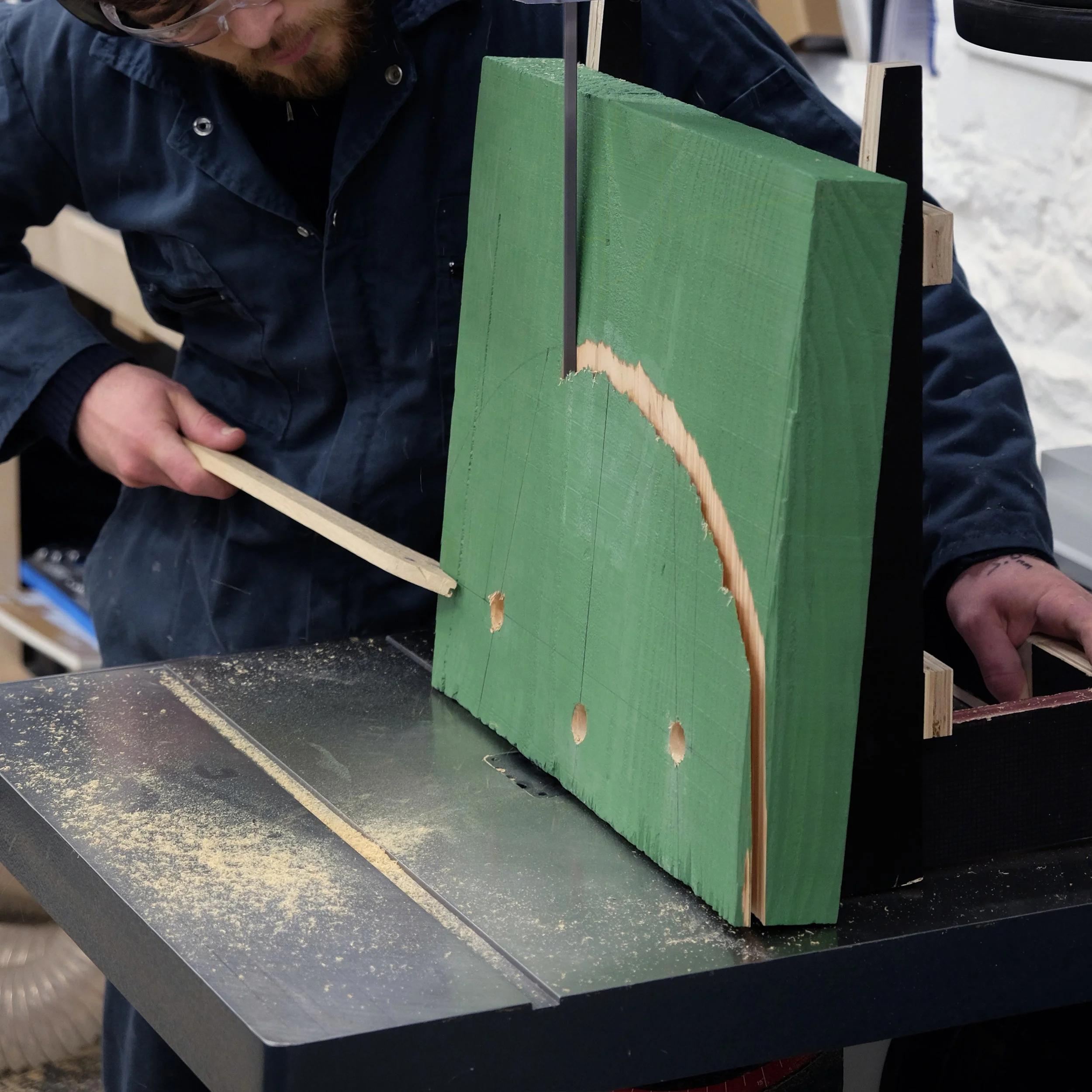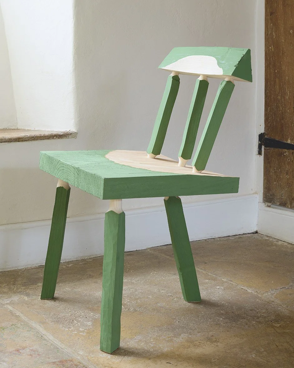 In this version of the Greenchair, all stock parts and lengths were coated with green milk paint before processing. This highlights any interventions or processing done by the craftsman.